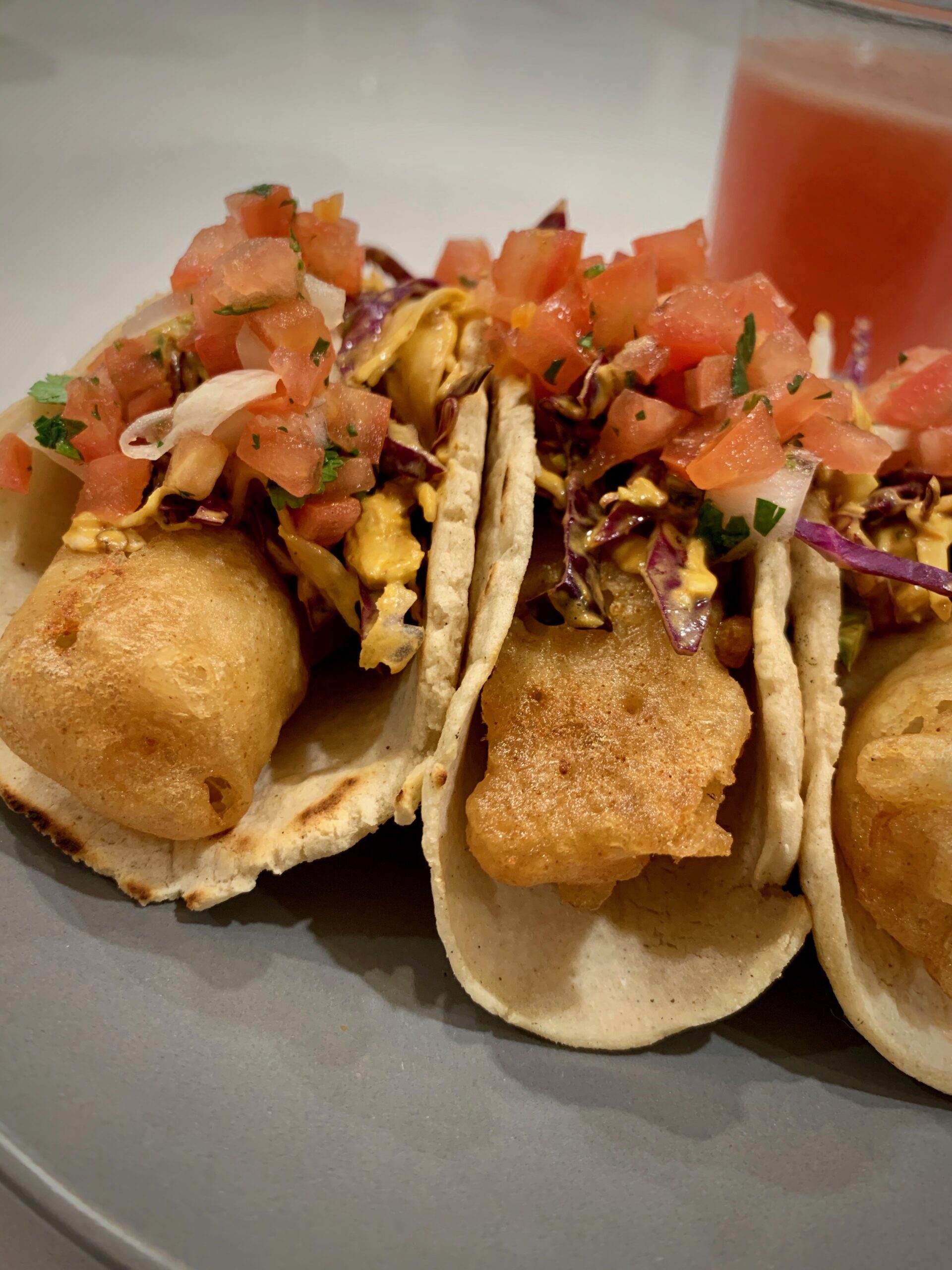 Fish Tacos, traditionally known as Baja style tacos consist of a cabbage slaw, a creamy sauce and some beer battered fish. We are not a fan of beer or any type of alcohol in our household so my substitute for the beer was the good old ginger-ale.