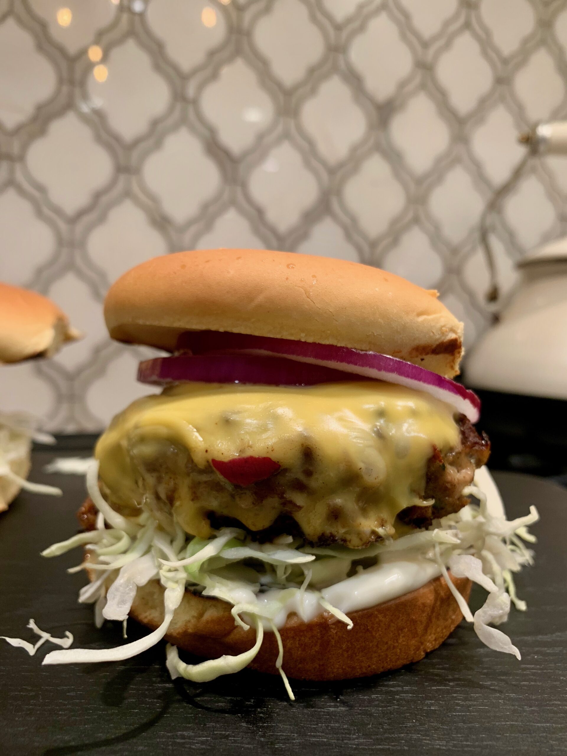 A simple American burger but infused with Pakistani spices. That is exactly how I describe this burger. With melted American cheese on top and a bed of garlicky labneh spread, this burger is perfection and always on demand. Its so quick and easy too. My brother especially requests this whenever he comes over because he’s the type to feel guilty if I am in the kitchen for too long. Of course it’s also because he thinks it’s delicious. This right here is a spectacular juicy beef Lahori burger.